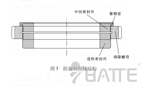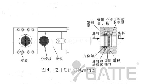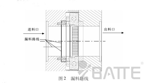 造成板式換網器密封處漏料原因:由圖1不難看出,在進料密封環通過調隙螺母與滑板緊密配合的情況下,進料密封銅環的另一端會和進料口的底端面分離,即產生一定的間隙。在這種情況下,要想真正不漏料,只有進料密封銅環的外徑和進料密封銅環放置槽的配合精度很高才行。但事實上,在加工中,由于加工誤差的原因,這種高配合是很難做到的,這時就會出現如圖2所示的現象,會產生微小的相對配合間隙。由圖2不難看出,當塑料溶液受到的壓力稍大時就會從產生的間隙中漏出來。
